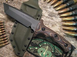 This Ultra Phalanx has a 6” blade . Same exact knife as the 7.5 just a little more compact. Its a super duty Killer knife made of the very best materials for the professional soldier or serious collector that likes well made high end quality knives. The Rolex of Combat Knives! This is the best Chopping, Slicing, Smashing, Camping, Hacking, Killing, Badass knife that incorporates some of the best characteristics a knife should have. This Treeman Ultra has a 6″ blade with a razor edge. I flat grind them and put a chisel edge on last so it’s like a pry bar with a razor’s edge, The skull crusher works great as a glass breaker attention getter. I had second thoughts on the skull crusher when I made the first Phalanx but 3 of the guys from Team 4 said “Hell yes to the skull crusher” I do make some with a rounded butt as well. This knife was machined, drilled so the handles fit perfect every time from knife to knife. I hand grind the blades from 1/4″ high carbon tool steel and have them vacuum heat treated to 56 RC. This knife has the Cerakote finish for superior durability and protection from elements. Will not rust . tough as nails. The full tang design has checkered g10 micarta or canvas micarta. This knife is badass and is ready to go to combat with a solid feel and an excellent grip in either hand. The thong loop will keep the knife in your hand, where it belongs and the overall length is 13 1/2″. Available with Treeman Leather or Kydex .The knife snaps in like a clip in a .45. never have to worry about noise or scratches you get from all other cheap Kydex. This kydex sheath is made to last a life time and hand down to the next generation.