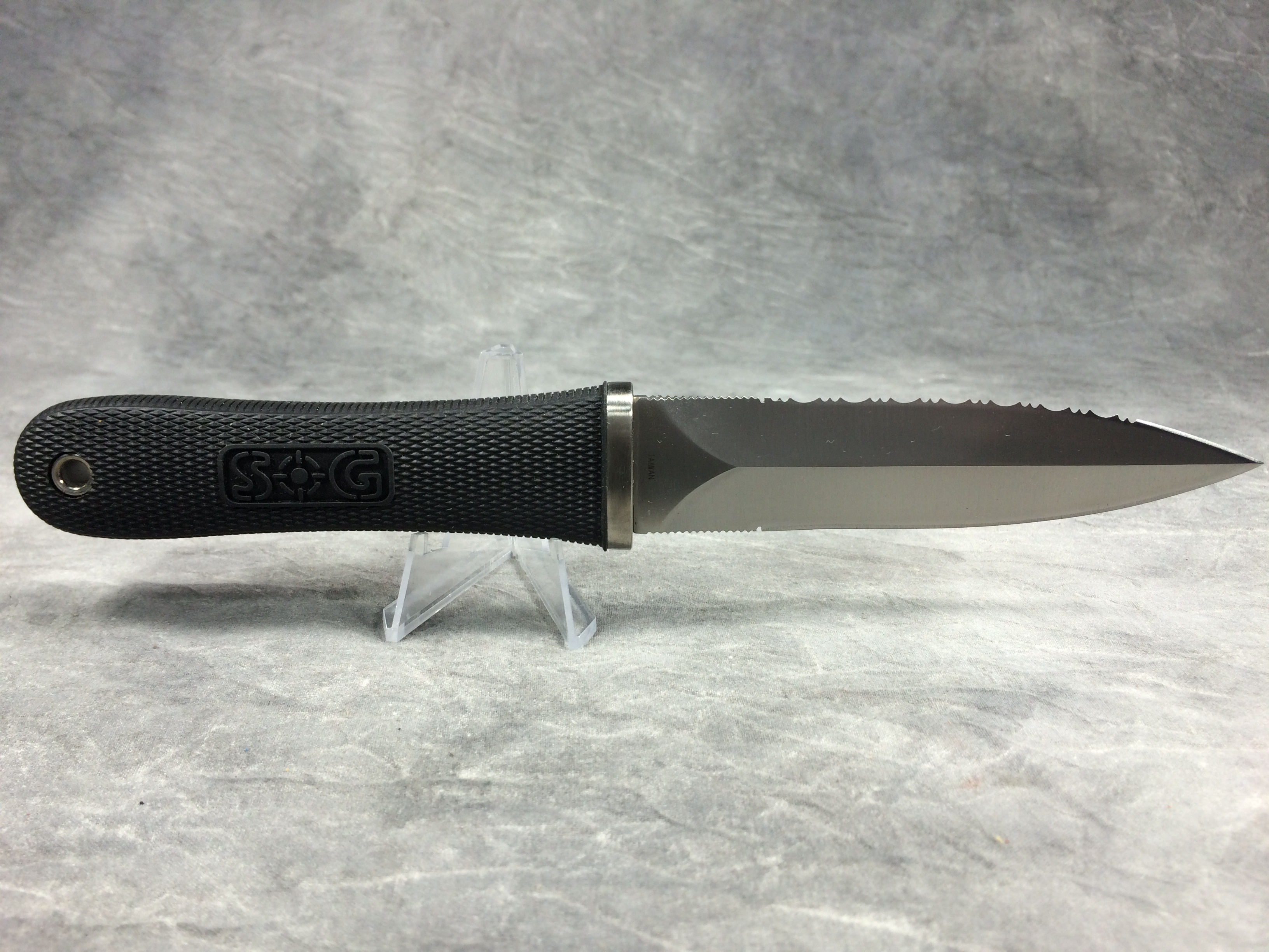The SOG Pentagon is one great dagger. The double edge makes this knife incredibly versatile. It is an outstanding tactical knife, designed as a backup for anyone. The handle is Kraton and is nicely textured just enough to provide a strong grip whether it is wet or dry and with our without gloves. I do recommend you pick up a Kydex holster for it. The Nylon sheath may not fit right in your boot.