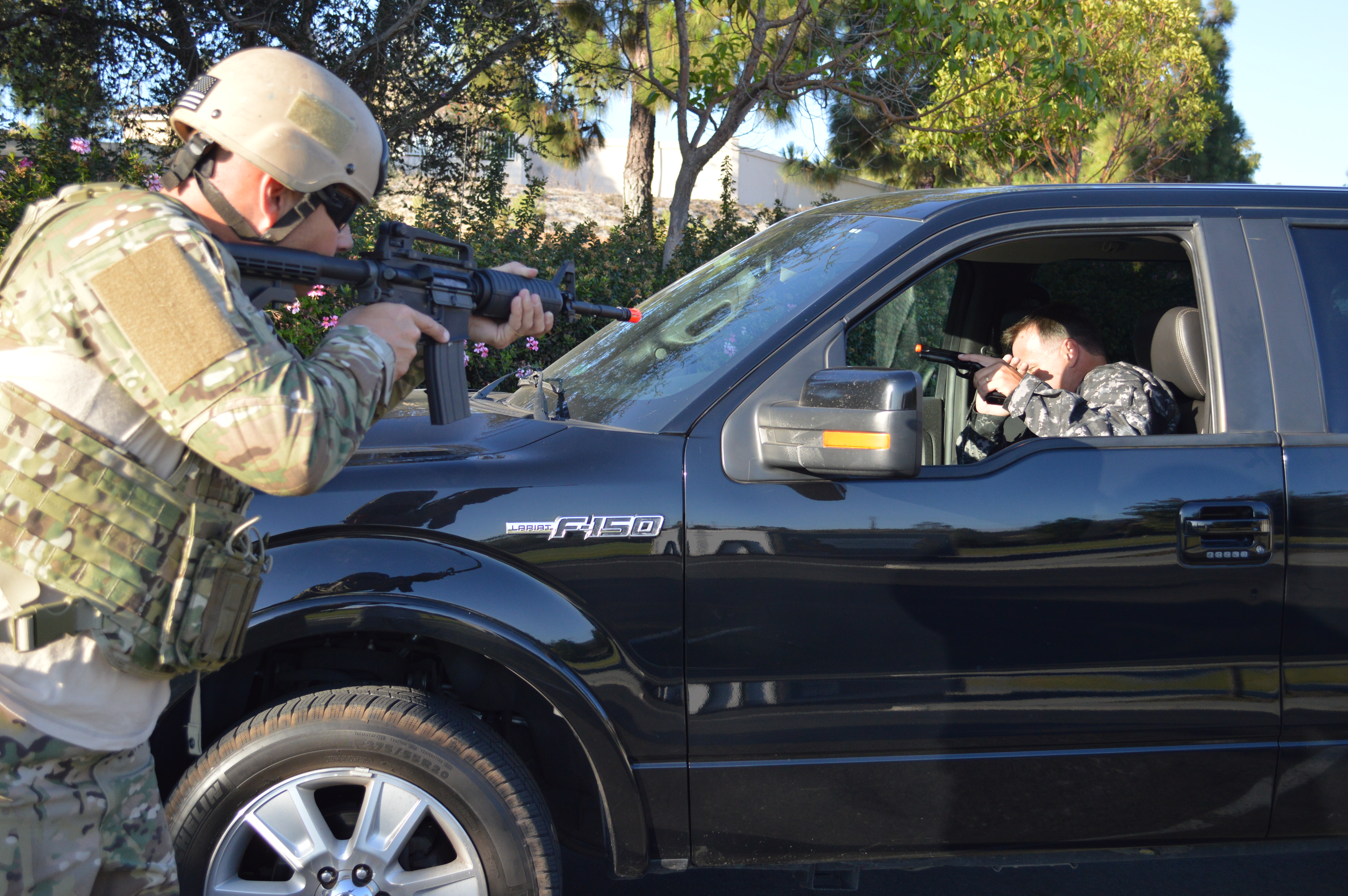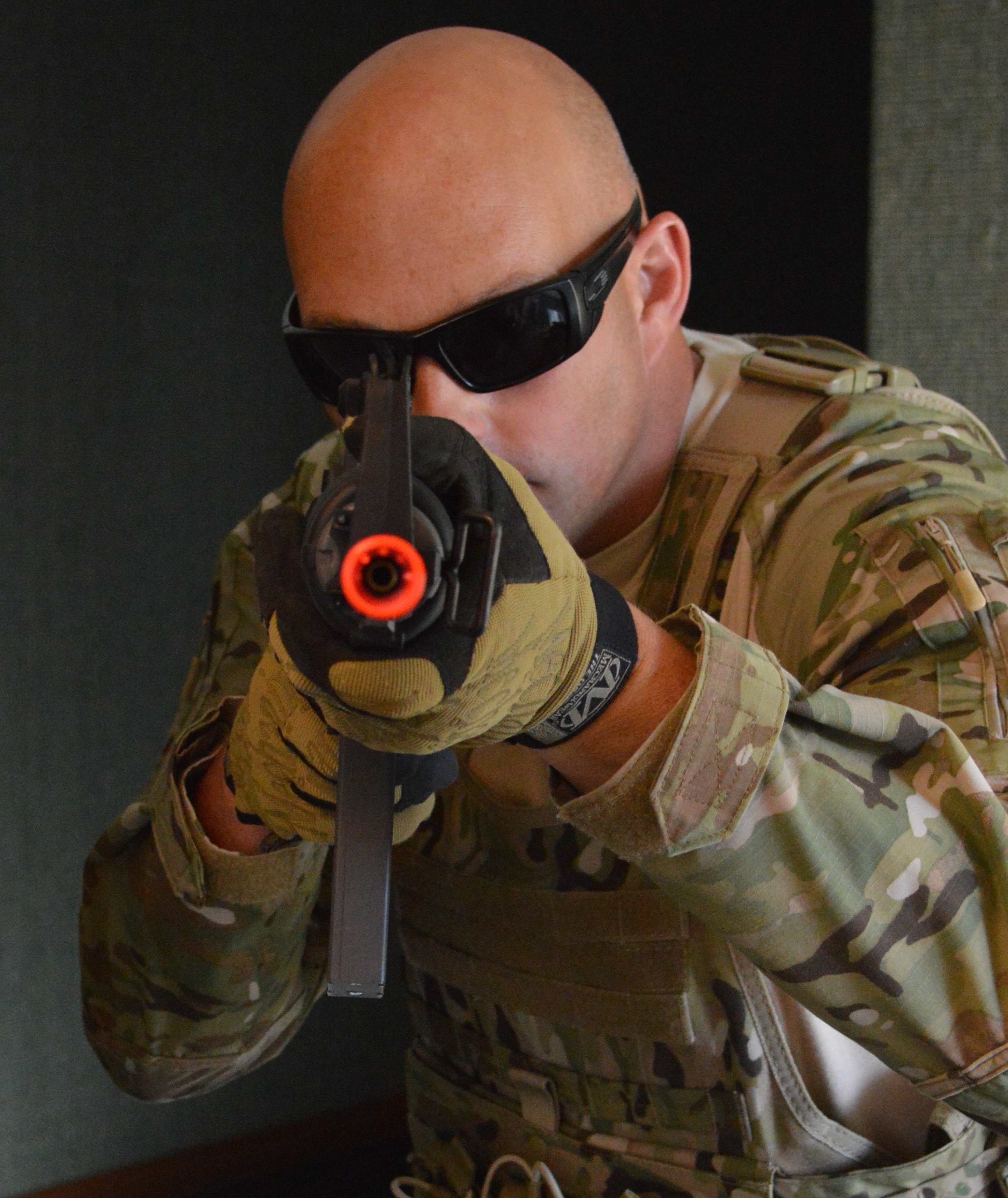 I prepare for whatever may come my way. Then suddenly I feel the squeeze on my thigh, “Ready” I knew, so I then motion my head up and down given the breacher motion to execute the breach. The breacher blows the door handle off with his black Remington 870, pump action 12 gage shotgun. I see that the door is open, already having the pin removed from the flash bang, I throw it inside the room. “Bang!” I rush for the door pushing it open with my shoulder, riding inward knowing where my own section of fire is and where I needed go. As I scan the room moving to my area of fire, I catch movement in the center of the room where I see the first contact. I noticed this big stocky guy in shorts and no shirt standing there about 8 inches taller than me and twice my size reaching for his weapon; without hesitation I start yelling and running towards him. He is not listening to me and grabbed for his weapon. As he was bringing the weapon up in my direction, I pulled my trigger on the M4 and lite the suspect up with, “Airsoft pellets.” Direct hit, the suspect dropped his weapon and falls to the ground. The Instructor walked in from outside and said, “Let’s do it again gentleman. “Roger that,” as the rest of the team smiles and headed for the door.