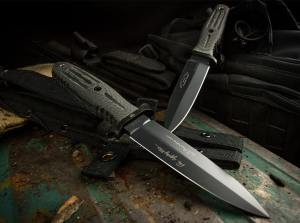 Among the entire variety of combat knives, completely blackened versions are basically a must-have. The black versions are very popular, not just for military operations, but also due to the special charisma of such dagger and the added corrosion protection provided by the coating. So it was basically our duty to add such a variant of the A-F 4.5 and A-F 5.5 models. Hardly any other knifemaker has influenced the field of tactical knives as much as William H. “Bill” Harsey, his designs have earned him an excellent reputation in the knife world. His modification of the legendary Boker Applegate-Fairbairn combines the knife used by many elite units with modern elements. The larger blade width and the more favorable geometry of the double edged N690 blade with black PVD coating improve the cutting properties, while the blade length offers an optimum compromise between guidance and utility value. The tang reaches out of the end of the handle and it can be used as a window breaker. The CNC-milled handle scales made of black Micarta are extremely durable, pleasantly structured and offer excellent grip even when wet. Delivery includes high-quality black nylon scabbard by SpecOps.