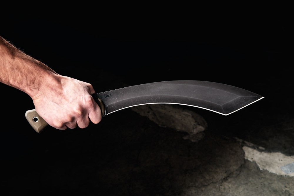 The forward sweeping edge widens toward the tip, which enables it to chop very similarly to a Kukuri design. At the pommel, the handle widens a bit to make it easy to hold on to when chopping heavily. The dangler Kydex sheath allows the knife to move around as you’re walking to it’s less likely to get caught up while walking through tall grass or brush and is held securely in place with a beta loop. If you like Kukuri designs, but you’re looking for something a little different, the A-Klub is sure to impress.