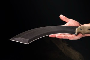 The knife is called, “A-Klub!” The massive blade is just over 12 inches of .19-inch-thick 1095 spring steel in the company’s subdued Acid Rain finish. Overall length: 18 inches and 23.8-ounce. What the heck right!!