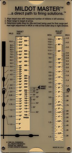 What a wonderful Snipers tool to have, “The Mildot Master.” The Mildot Master is an analog calculator (slide rule) that is primarily designed to rapidly provide range to target by aligning the estimated target size directly opposite the mildot measurement of the target. But remember!! Nothing can replace the knowledge of making calculations on your own.