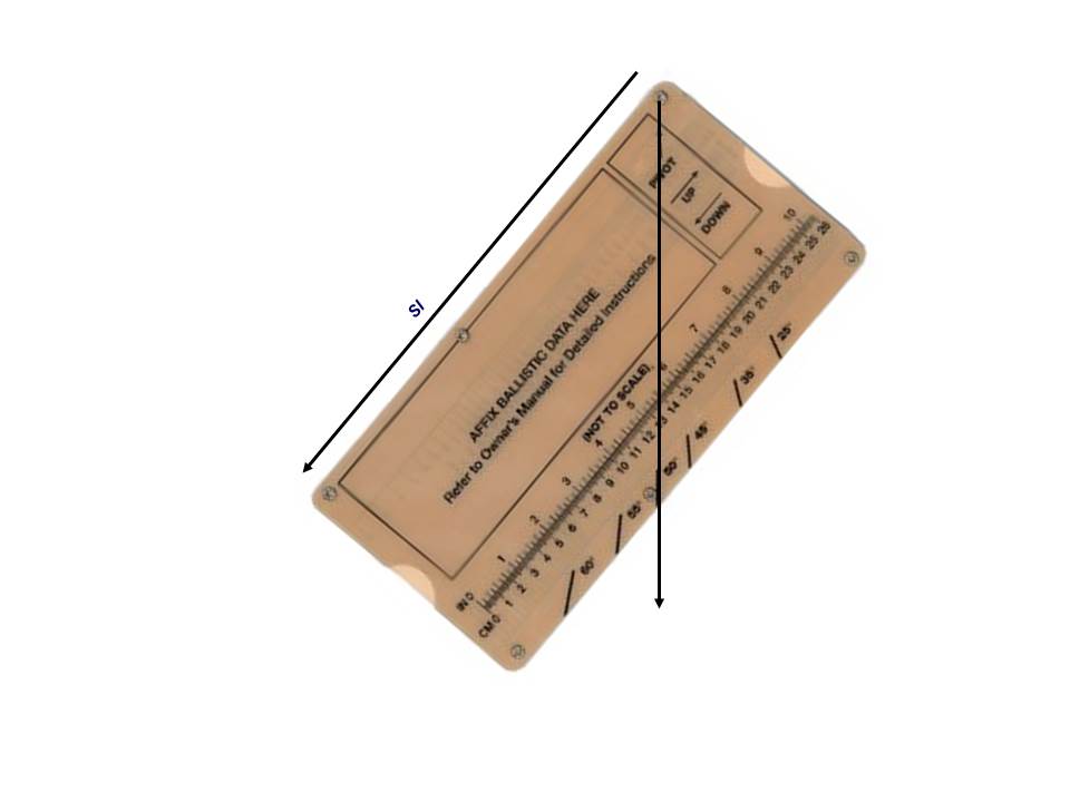 Just below the Target Range index mark, there is a series of marks corresponding to finding angles, up to 60 degrees, select the angle measured, and read the “actual horizontal range” directly opposite that figure. In the example below, a target determined to be 300 yards distant and at an angle of 45 degrees result in an actual horizontal range of 210 yards.
