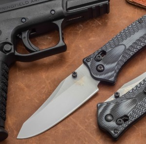 I had the cool blue colored frame with the satin-finished blade. I flipped the blade out as if it is was spring-assisted and held it up so everyone could see. The blade was a Plain Reverse Tanto with a Finish Satin Blade Steel: 154CM (58-61) The Handle Material is Gray and Black textured G10. I think everyone’s eye was hooked on the handle. It was a very unique design. It would catch the eye of anyone. I explained to everyone around me that I picked this style because I found it to be reliable, comfortable and suited my needs when I knife fight.