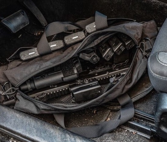 profile upon request of Law Enforcement and First Responders. The Transport Bag is the ideal size for storing in a vehicle, either behind or under the seats. Should you need to rapidly reacting to a critical situation, the Transport Bag can be easily grabbed and brought into the fight. The main compartment has ample room for a handgun or even a folded PDW/SBR, along with additional magazines, medical supplies, food/water, and other essentials. One wall has two zippered mesh pockets for organization, while the opposite side has a loop panel for attaching a hook-backed holster or pouch, as well as six elastic loops that are perfect for pistol magazines, flashlights, and other similarly shaped items. On the exterior, both ends feature generously sized pouches with hook and