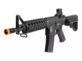 This semi/fully automatic Colt M4 rifle delivers high-powered shot velocities that put you ahead of your competition on the battlefield. The gun is a 1:1 scale replica of a real M4 and features authentic Colt trademarks on the receiver. This gun also features a 4-position adjustable stock, a high-capacity 350 rd magazine, and a shot velocity of 390-400 fps (using .20g BBs). This rifle is great for cqb airsoft skirmish scenarios and has a Weaver/Picatinny quad rail for mounting optional flashlights and scopes of your choice. An adjustable hop-up unit also lets you hone the accuracy on all of your long distance shots.