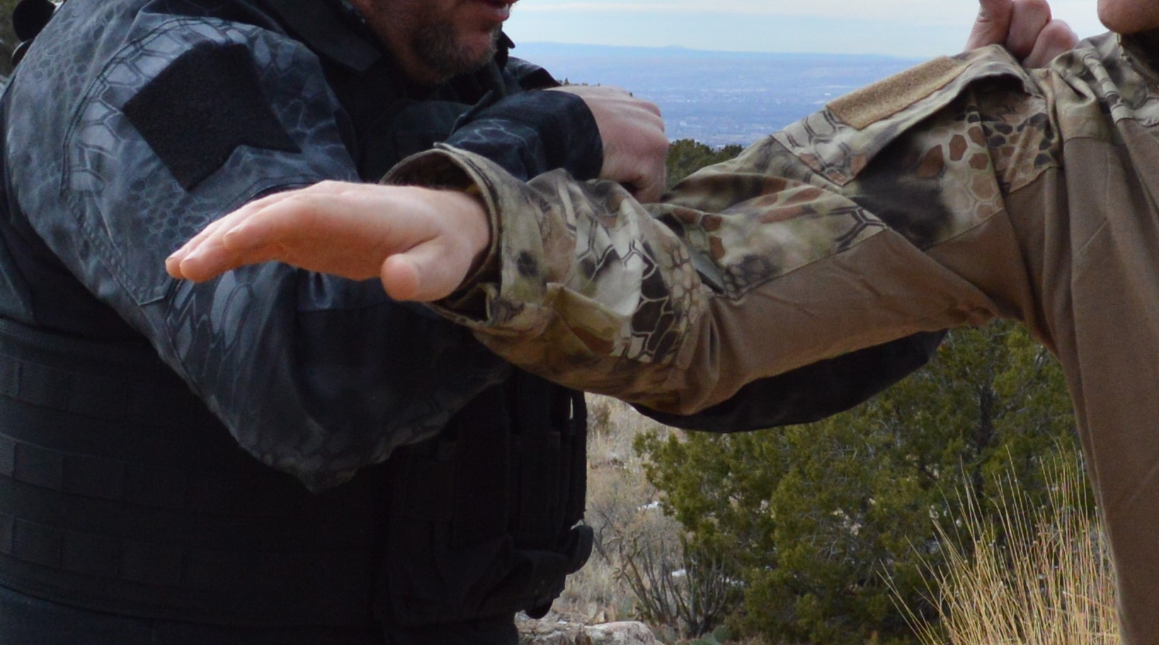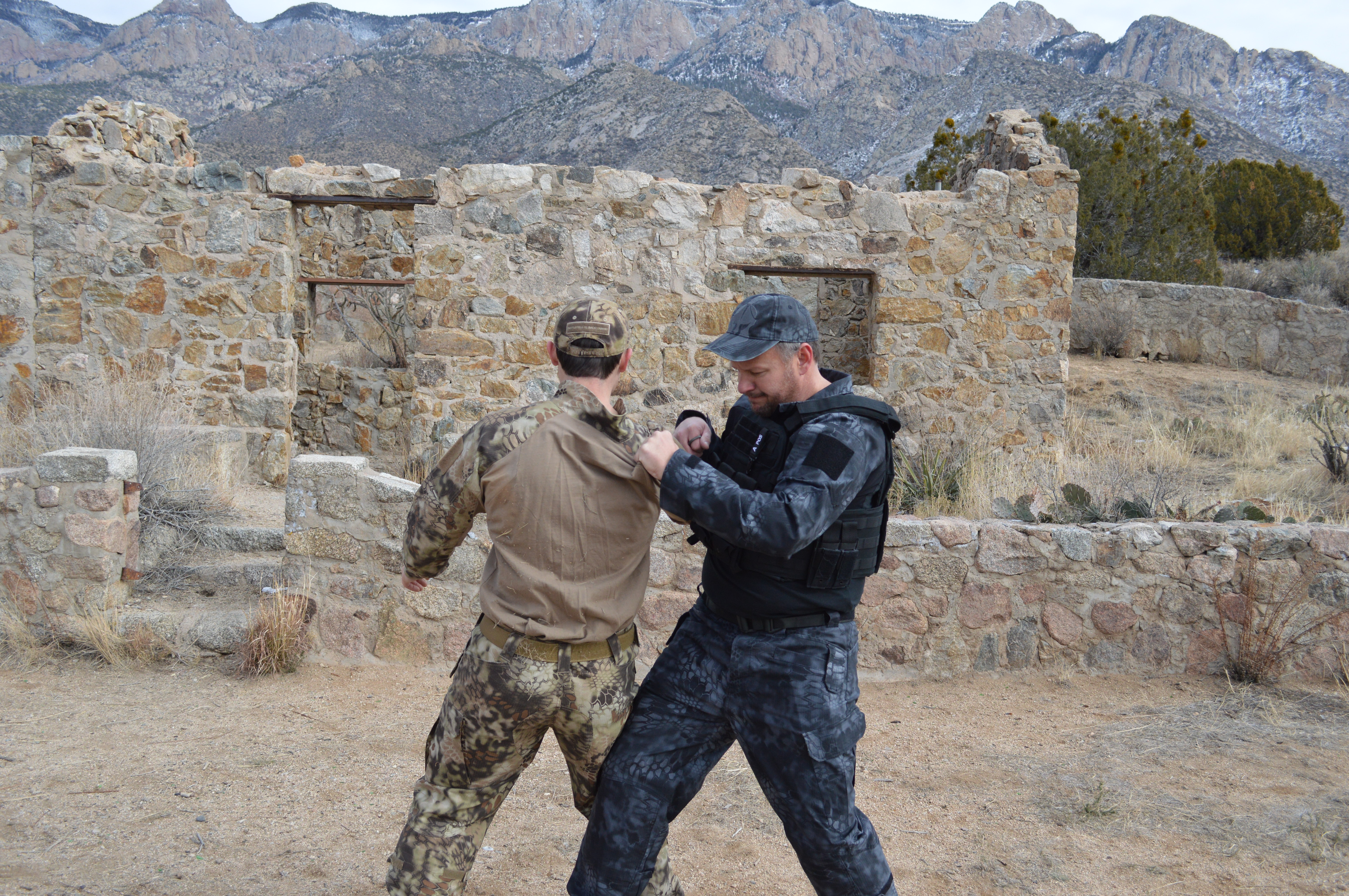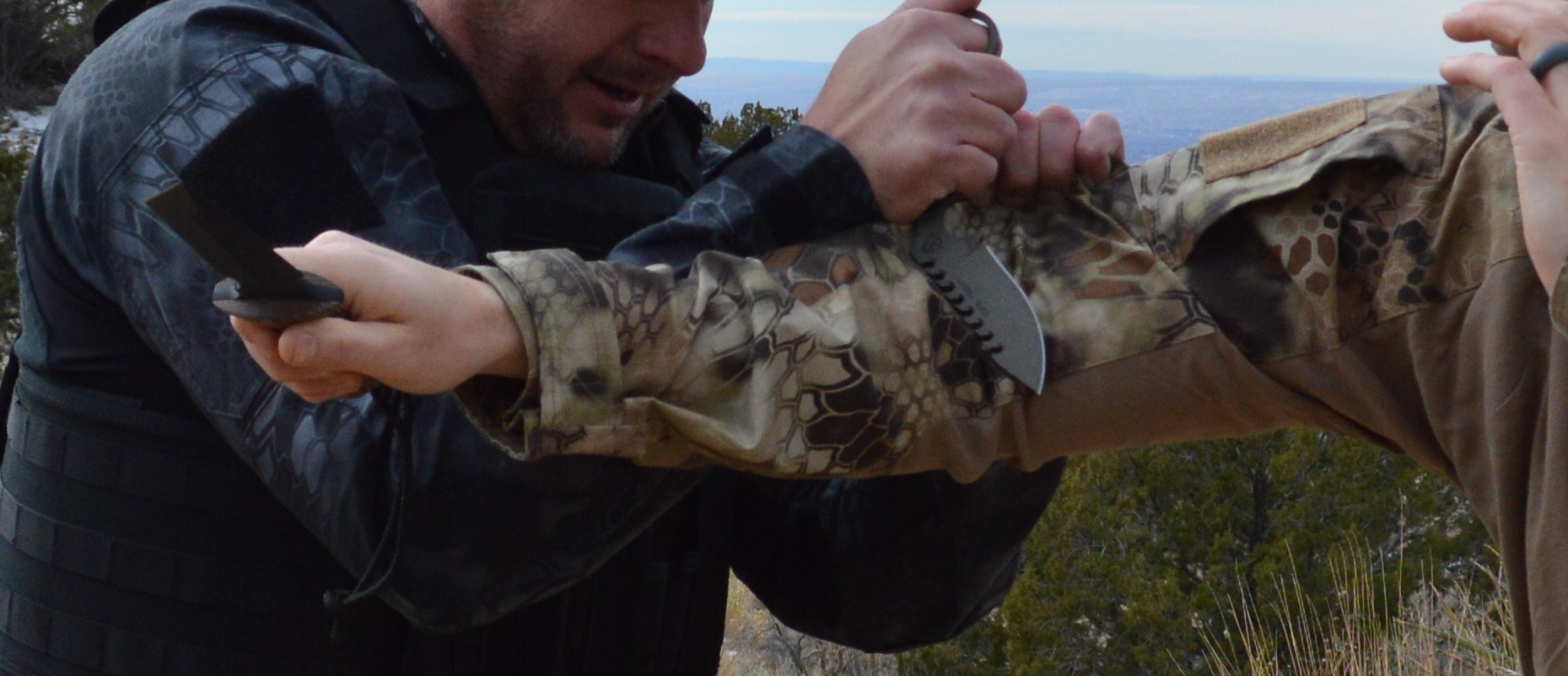 When you block the strike you can use the knife to cut the back of the arm as well. Or drop the knife on the inside of the arm (see picture above) and using your elbow, fold his arm into the knife. This is a great vantage point, because you can either control and cause pain or cut the tendons in the arm for control that way. Then with you left hand, grab the back of his shirt, vest, hair or whatever you can grab. While maintaining control with your grab, “C” step with your right leg