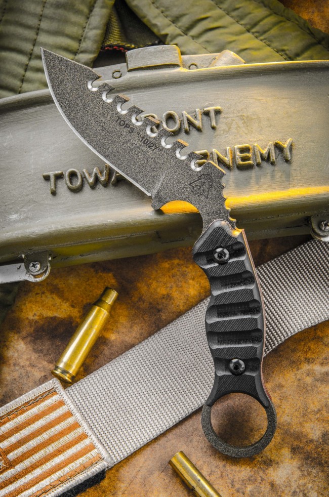 TOPS “10/27” was built in true TOPS form. It is sizable and powerful, yet comfortable to hold and use. The handle profile along with the G10 scales make it easy to deploy. The deep groove near the blade, as well as the index finger hole, which is ample for very large hands and smaller hands, help avoid slipping and provide a secure grip. Our New Tactical Stone coating completes the package. TOPS “10/27” is sure to intimidate any opponent, especially in self-defense situations. No one messes with a TOPS knife.