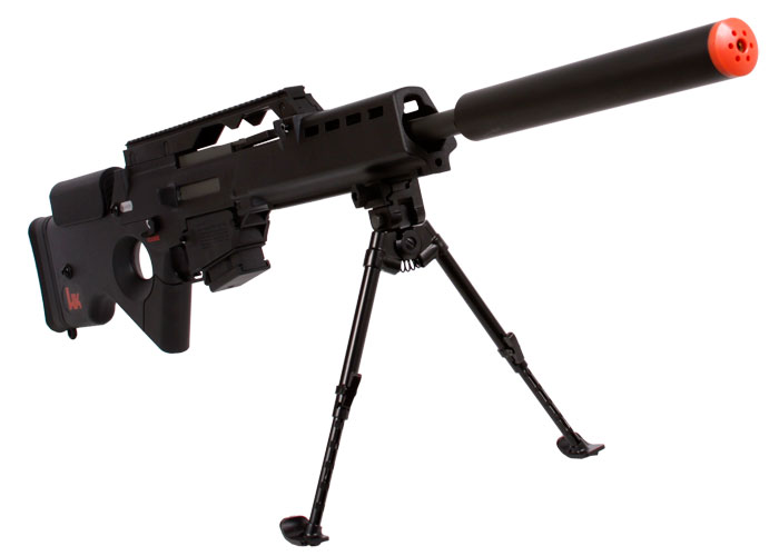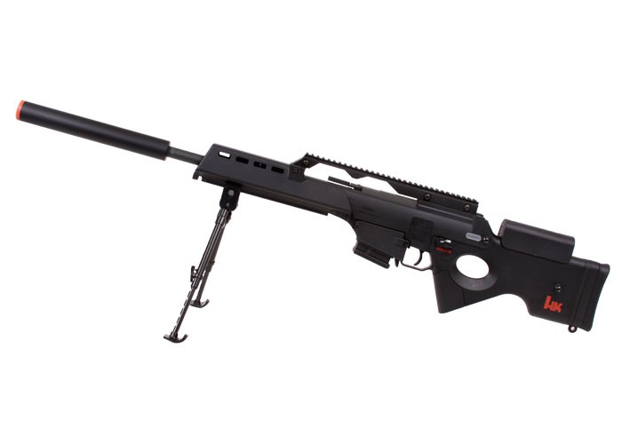 The H&K SL9 Elite is one of the most anticipated airsoft guns to be released. This gun has undergone some modifications from its original version. The SL9 Elite now comes with a full metal barrel extension and an included bipod for superb sniper support. The SL9 Elite also features a durable ABS plastic receiver & thumbhole stock, a 35 rd magazine and a shot velocity of 440-460 fps (using .20g BBs). The SL9 also has the ability to use G36 magazines! The cheek rest is adjustable and can accommodate nearly any shooter comfortably. Mount a rifle scope on the monolithic Weaver/Picatinny rail for added accuracy in the battlefield. Airsoft enthusiasts, don’t miss this gun!
