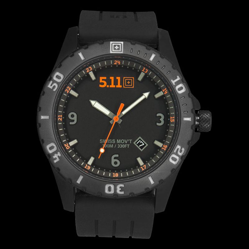 Equally at home in the boardroom or on a battlefield, the 5.11® Sentinel Watch combines reliable Swiss movement with modern engineering to produce an elegant and highly functional timepiece that stands up to the toughest environments. A scratch and chip resistant mineral glass face is treated with an anti-reflective coating to minimize glint, phosphorescent hour and minute hands enable low light operation, and a heavy duty silicon strap and buckle ensure lasting durability and secure closure. Along with offering an integrated compass the stainless steel case is water resistant to 100 meters, and a ratcheting dive bezel supports SCUBA use.